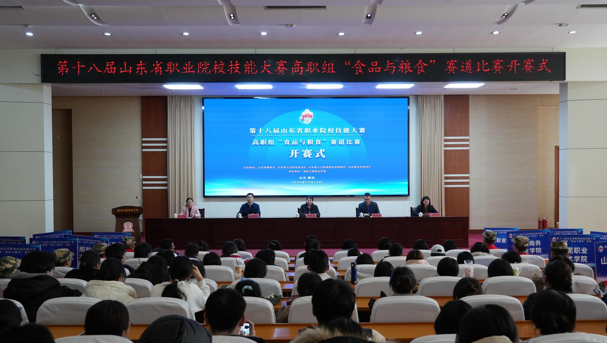 12月15日至17日,第十八届山东省职业院校技能大赛高职组“食品与粮食”赛项在我院成功举办。学院院长王忠山、大赛监督仲裁长、裁判长等出席开幕式。经过为期三天的激烈角逐,来自全省27支职业院校代表队、108名选手齐聚赛场,共评出金奖3项,银奖6项,铜奖9项。我院农林科技学院吕梦爽、孙艺嘉、房婉婷三位同学组成的参赛队伍凭借扎实的专业功底与出色的实操表现斩获金奖。